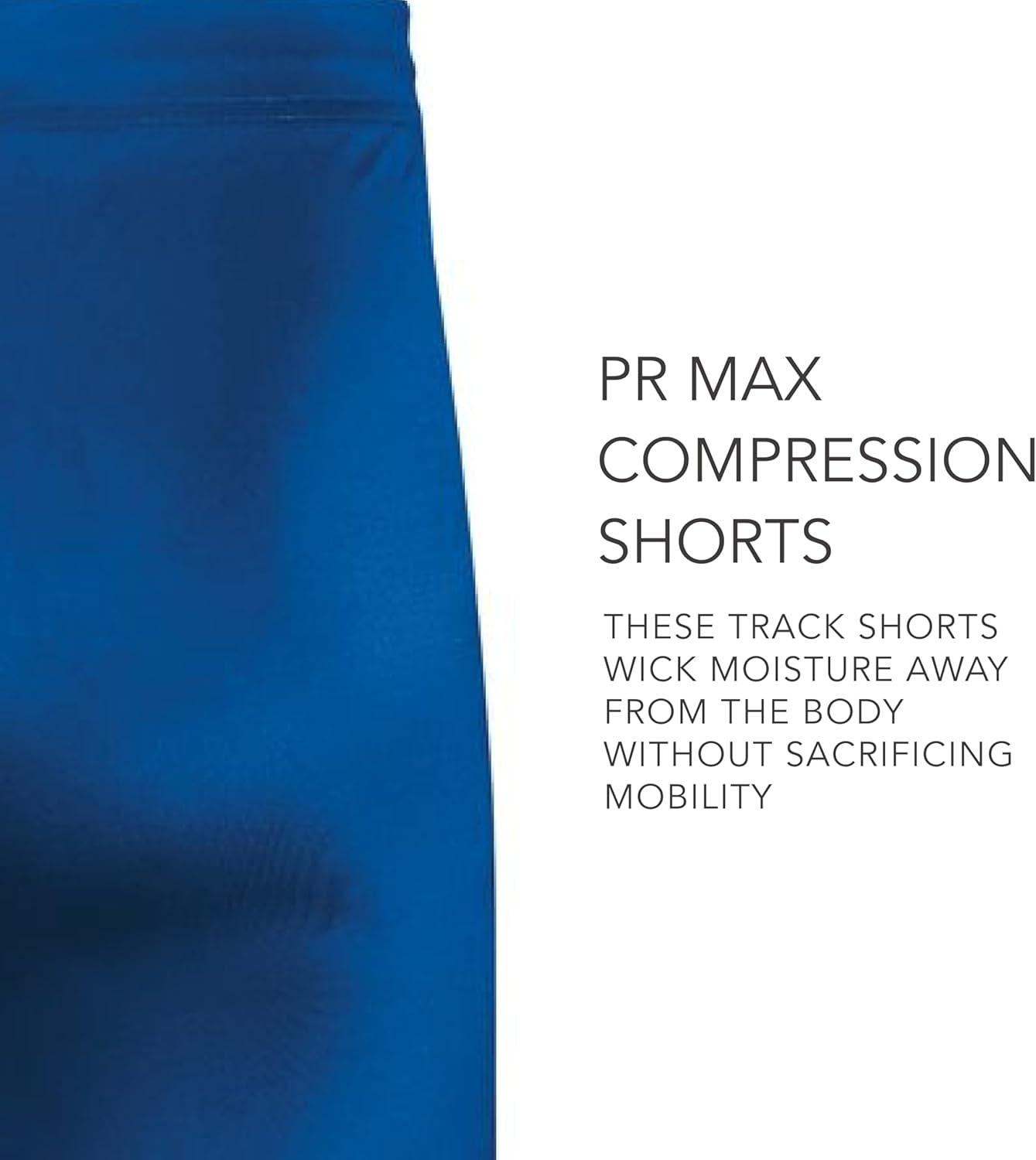 Reach for a new personal best in our PR Max Compression Shorts. These track shorts feature a heavyweight polyester/spandex knit that wicks moisture away from the body without sacrificing mobility. They also boast color secure® technology that helps prevent dye migration during screen printing.