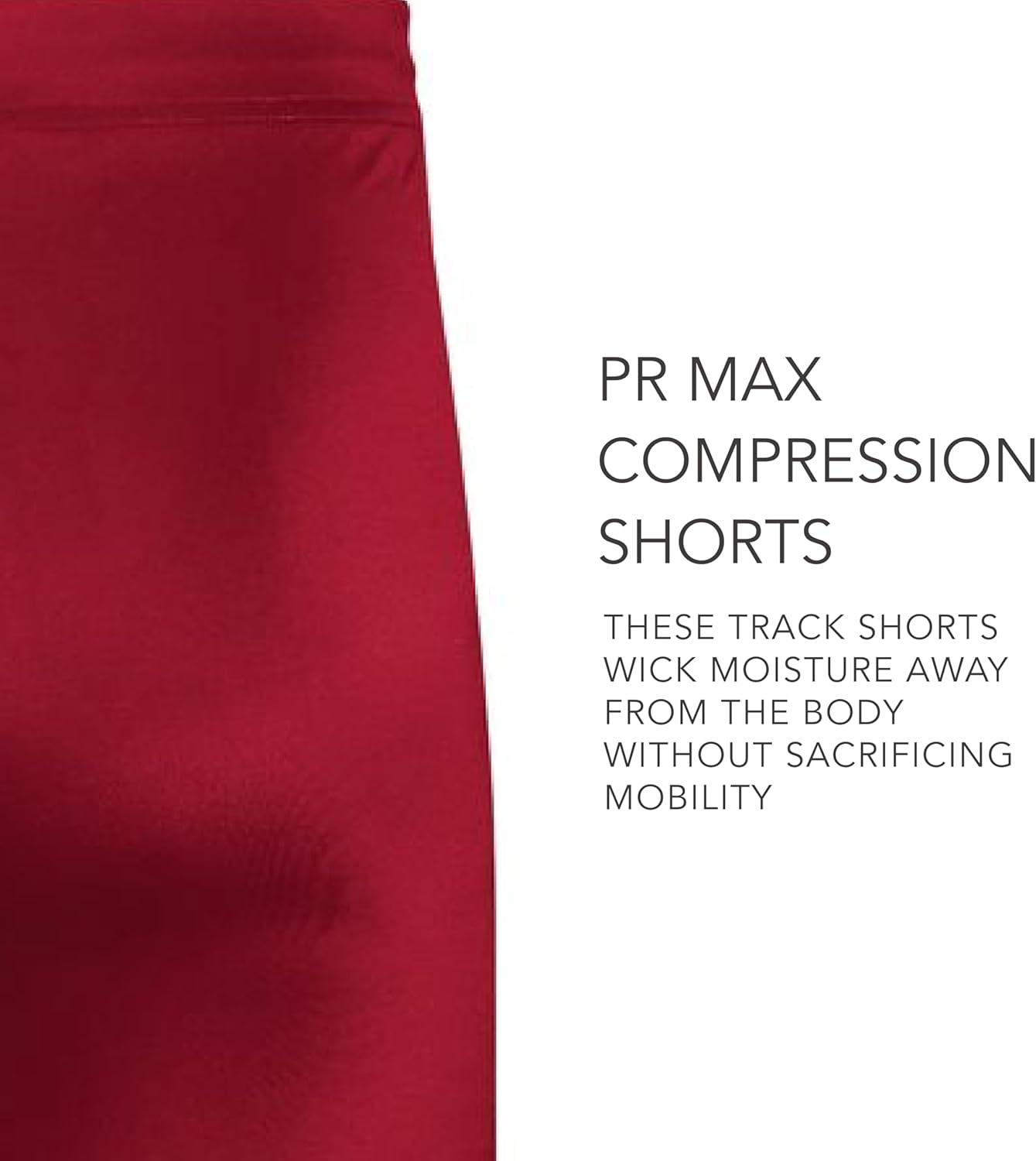 Reach for a new personal best in our PR Max Compression Shorts. These track shorts feature a heavyweight polyester/spandex knit that wicks moisture away from the body without sacrificing mobility. They also boast color secure® technology that helps prevent dye migration during screen printing.