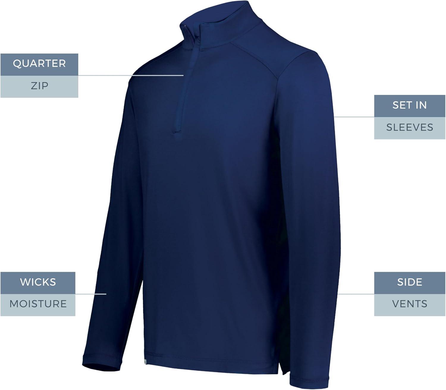 The Ventura 1/4 Zip Pullover from Holloway offers a comfortable and eco-friendly option for your wardrobe. Made with Ventura Suede Knit, which weighs 6.34 ounces, the pullover comes in two varieties: solids are made from 89% recycled polyester and 11% spandex, while heathers blend 45% recycled polyester with 44% polyester and 11% spandex. This mix ensures both sustainability and stretch for ease of movement. Featuring moisture-wicking technology, this pullover keeps you dry during various activities. Its design includes a tag-free label for added comfort, especially during extended wear. The quarter zip style allows for easy temperature regulation and a versatile look. The pullover's set-in sleeves with rolled forward shoulder seams provide a better fit, and side vents enhance breathability. Whether for a casual day out or light exercise, the Ventura 1/4 Zip Pullover is a practical and subtle choice.