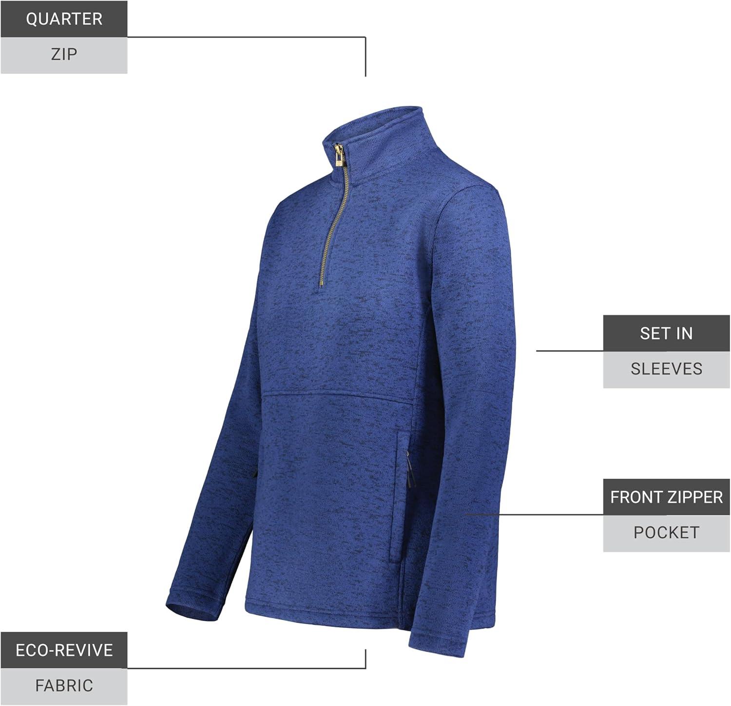 The Ladies Alpine Sweater Fleece 1/4 Zip Pullover from Holloway is the perfect choice for those seeking both comfort and style. Made from Eco-Revive™ product featuring 80% recycled polyester/20% polyester, this pullover is not only environmentally friendly but also provides warmth and durability. The hanger loop label and quarter zip pullover style add an extra touch of elegance to this piece. Featuring set-in sleeves and front zippered pockets, this sweater fleece pullover is practical for everyday wear. The open bottom design also adds an extra element of versatility, allowing for a comfortable fit. Whether you're out running errands or enjoying a cozy night in, this pullover is the perfect addition to any wardrobe. The classic design and color options make it a great choice for both office days and casual nights. With the added benefit of being eco-friendly, you can feel good about your fashion choices while staying warm and comfortable in the Ladies Alpine Sweater Fleece 1/4 Zip Pullover.