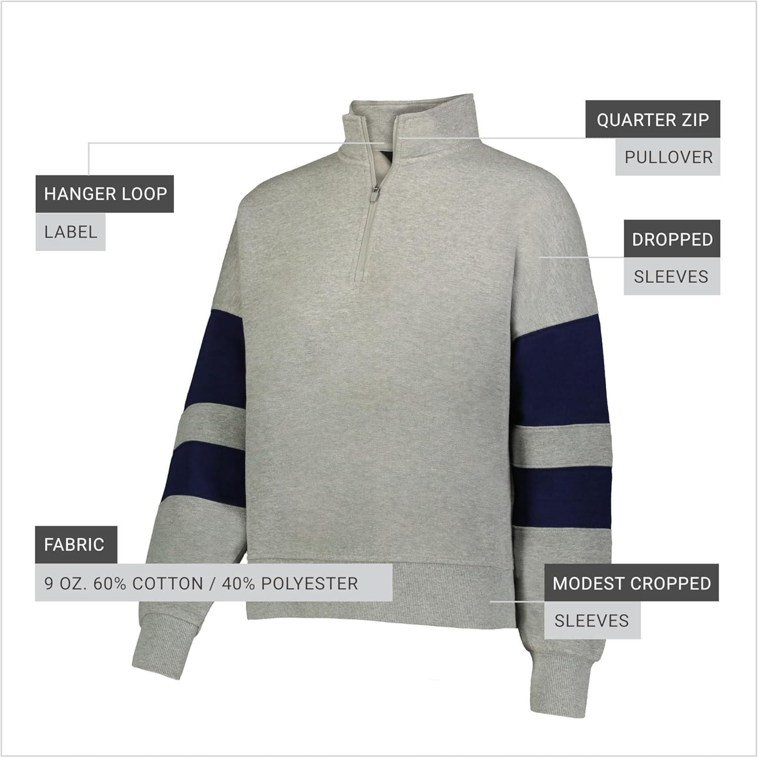 A modern quarter zip pullover with a modest cropped length, dropped shoulders for comfort, and soft fleece warmth.