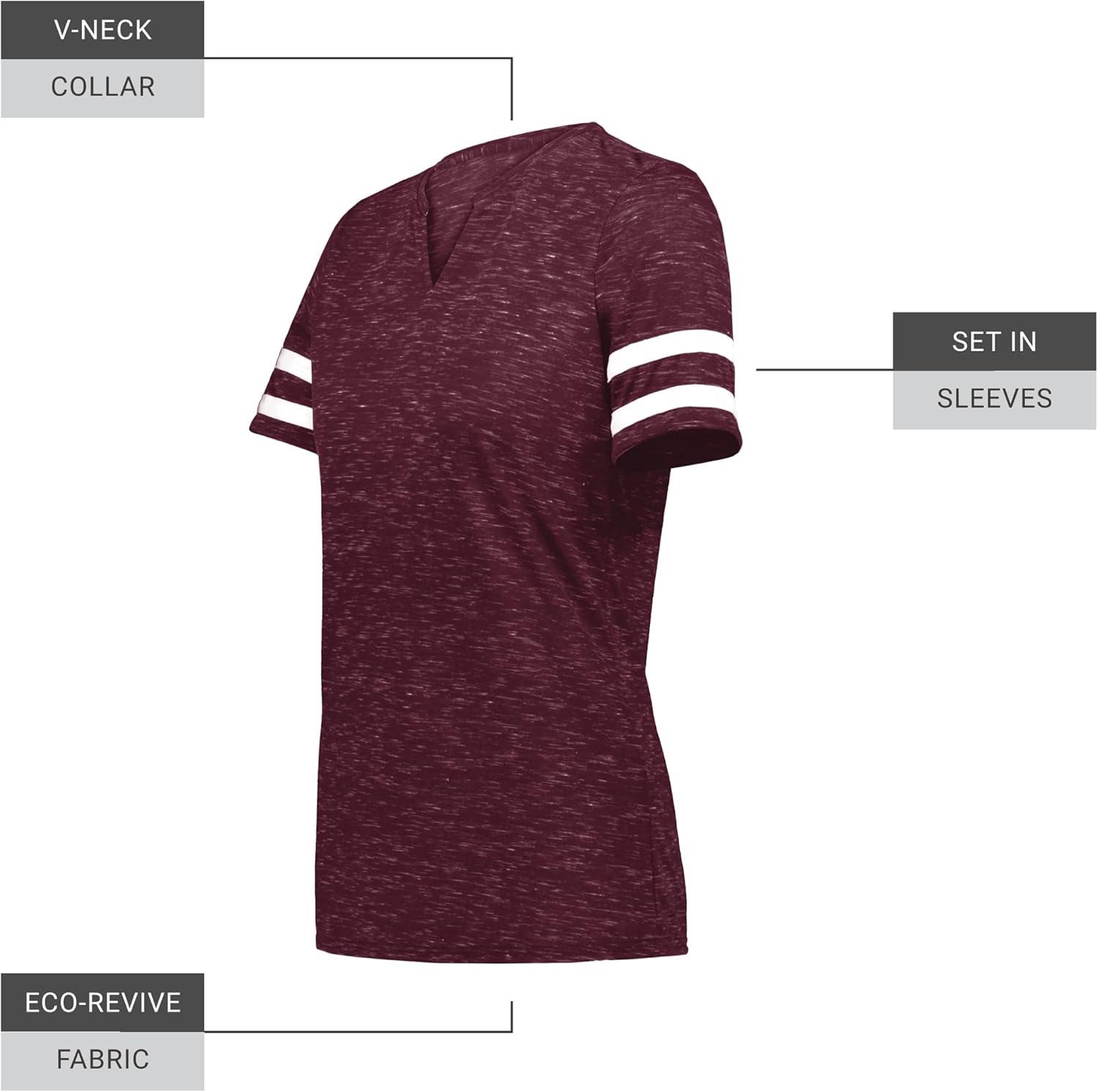The 223245 Ladies Monterey Tee (Eco-Revive) from Holloway is perfect for the eco-conscious fan. Made with 95% recycled polyester and 5% cotton, this tee is not only sustainable, but also moisture-wicking to keep you dry during intense workouts. the ladies' fit and tagless label provide maximum comfort, while the V-neck collar and set-in sleeves offer a classic and stylish look. This tee is perfect for both team sports and individual training, and its eco-friendly design makes it a great choice for those looking to reduce their environmental impact. Whether you're hitting the gym or hitting the field, the Ladies Monterey Tee will keep you cool, dry, and comfortable. This tee is available in a variety of colors to match any team or individual style, and the lightweight and breathable material makes it ideal for all seasons. Upgrade your training gear with the sustainable and stylish 223245 Ladies Monterey Tee from Holloway.