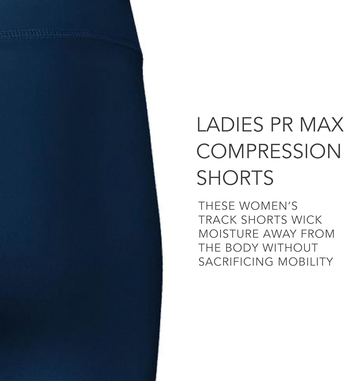 Reach for a new personal best in our Ladies PR Max Compression Shorts. These women’s track shorts feature a heavyweight polyester/spandex knit that wicks moisture away from the body without sacrificing mobility. They also boast color secure® technology that helps prevent dye migration during screen printing.