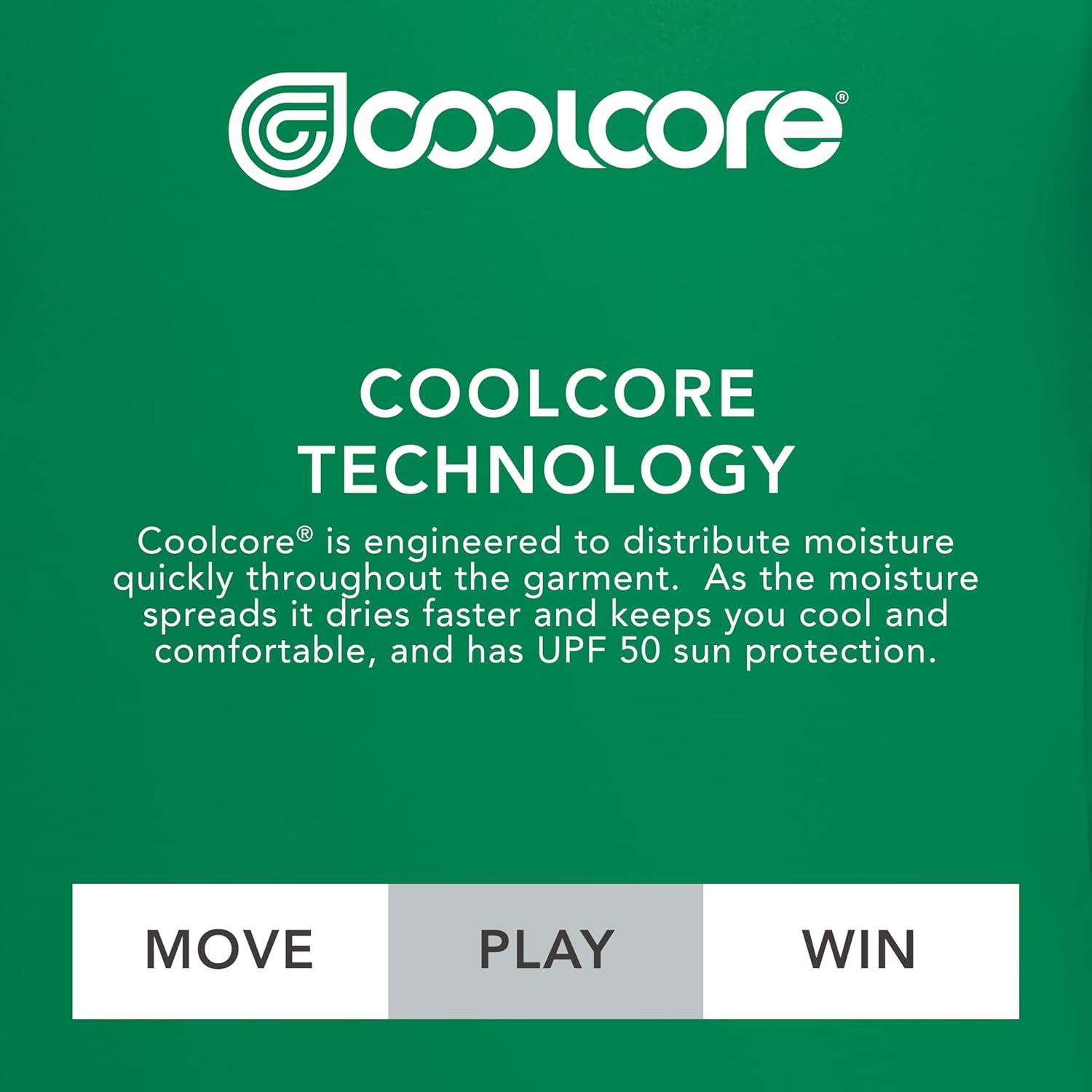 Coolcore fabric is engineered to distribute moisture quickly throughout the garment. As the moisture spreads it dries faster and keeps you cool and comfortable, and has UPF 50 sun protection.