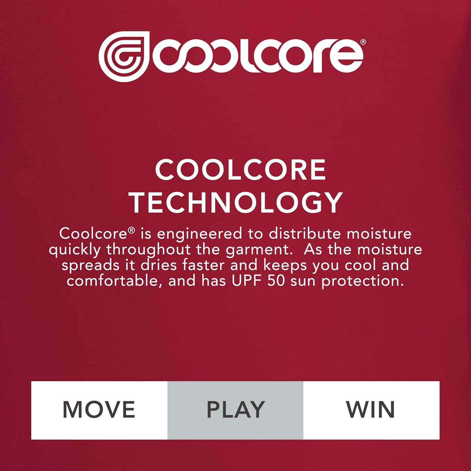 Coolcore fabric is engineered to distribute moisture quickly throughout the garment. As the moisture spreads it dries faster and keeps you cool and comfortable, and has UPF 50 sun protection.